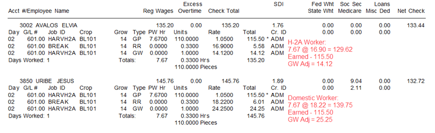 Employee 3002 is an H-2A worker with the adverse compensation adjustment. So, their break rate and their minimum wage are adjusted to the rate of 16.90.