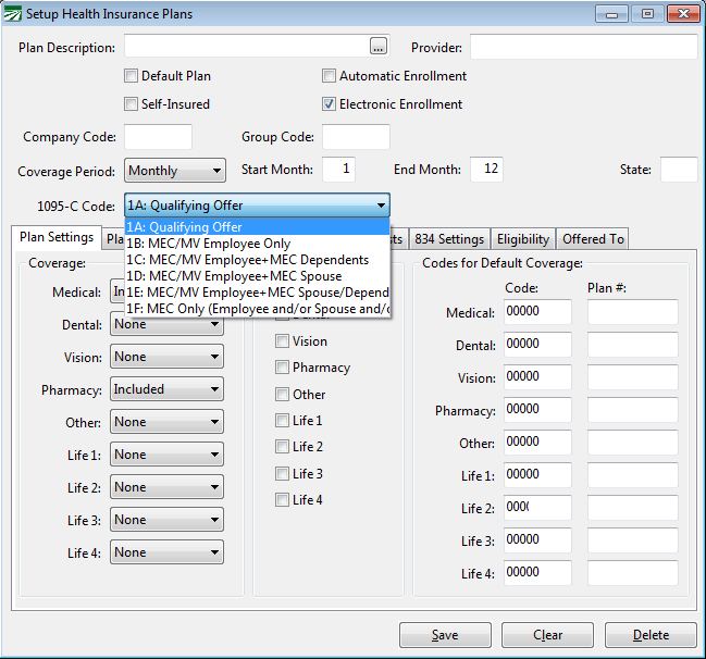 When code 1A is used, it is not necessary to report any amounts on line 15. When one of the other codes is used (1B, 1C, 1D, 1E, 1F) then you must report the amount of the employees contribution for each month on the 1095-C. This program will use the Employee Share for Self Only coverage to report this amount. (Of course this should already be a part of your plan setup for the employee deductions to be calculated.)